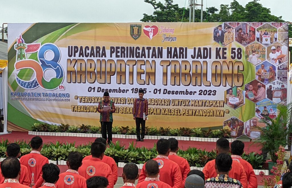 TANJUNG,TRIBUNEPLUSONLINE.COM Upacara peringatan hari jadi Tabalong ke-58 tahun 2023 dilaksanakan, Jumat (01/12/2023), di Teras Taman Giat Kota Tanjung.