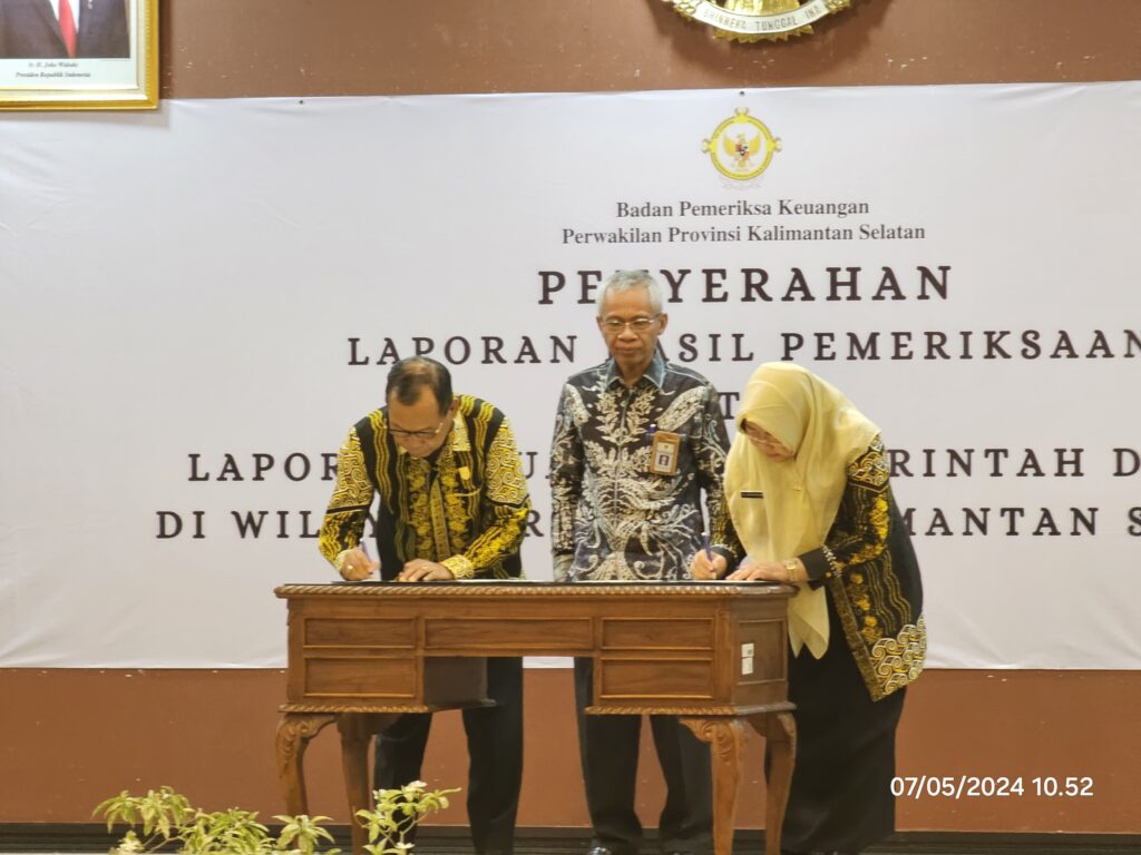 Penyerahan Laporan Hasil Pemeriksaan atas Laporan Keuangan Pemerintah Daerah (LKPD) di Wilayah Provinsi Kalimantan Selatan Tahun 2023 secara resmi berlangsung di Kantor BPK RI Perwakilan Provinsi Kalsel di Banjarbaru, Selasa 7 Mei 2024 pagi.