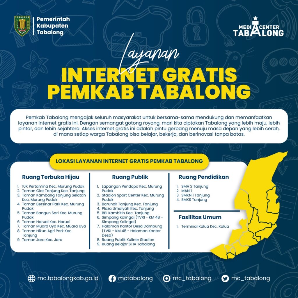 Pemasangan Internet gratis atau Layanan Internet gratis oleh Pemerintah Daerah melalui oleh Diskominfo Kabupaten Tabalong bertujuan mengajak masyarakat secara bersama sama mendukung dan memanfaatkan layanan ini dengan semangat dan gotong royong demi menciptakan Tabalong yang lebih maju sejahtera sebagai daerah penyangga Ibu Kota Nusantara ( IKN ).