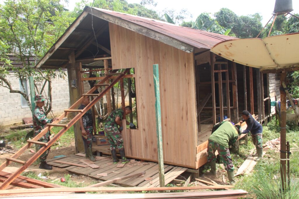 Pasi Ter Kodim 1008/Tabalong Kapten Inf Fendri Rianto mengatakan progress rehab rumah tidak layak huni di Desa Kasiau Raya saat ini memasuki tahap pemasangan kerangka dan papan kayu.