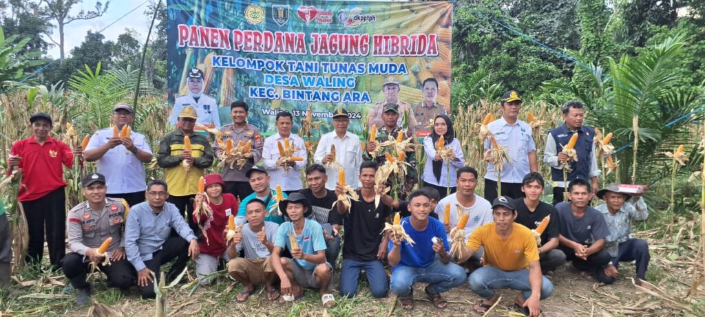 TANJUNG,TRIBUNEPLUSONLINE.COM Polda Kalsel – Polres Tabalong melalui Kapolsek Bintang Ara melaksanakan Panen perda Jagung Hibrida bersama Taruna Tani Tunas Muda, kegiatan ini salah satu upaya mendukung kelangkaan pangan. Pada hari Rabu, 13 November 2024, pukul 14.00 WITA, di Murung Waling RT.04, Kecamatan Bintang Ara. Kegiatan ini dihadiri oleh sejumlah pejabat dan tokoh masyarakat, yang menunjukkan dukungan terhadap ketahanan pangan daerah.