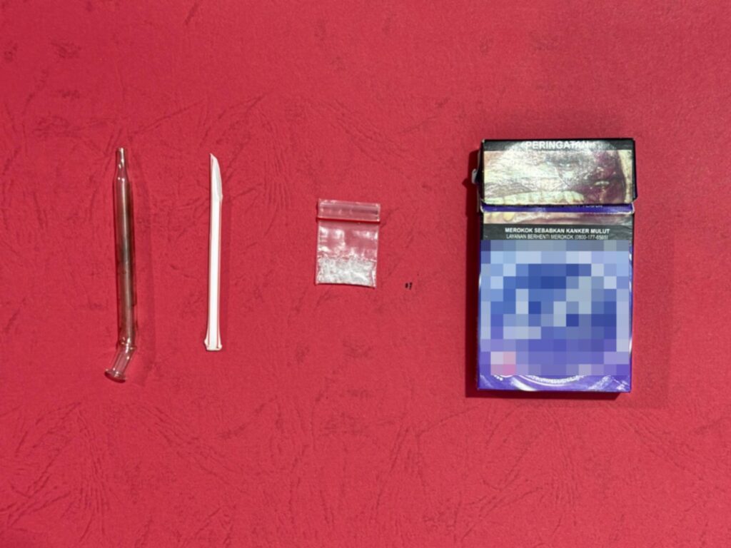 Saat didekati dan diperiksa, didalam tas pelaku ditemukan beberapa barang bukti diantaranya 1 bungkus plastik klip yang berisi serbuk bening diduga narkotika jenis sabu-sabu.