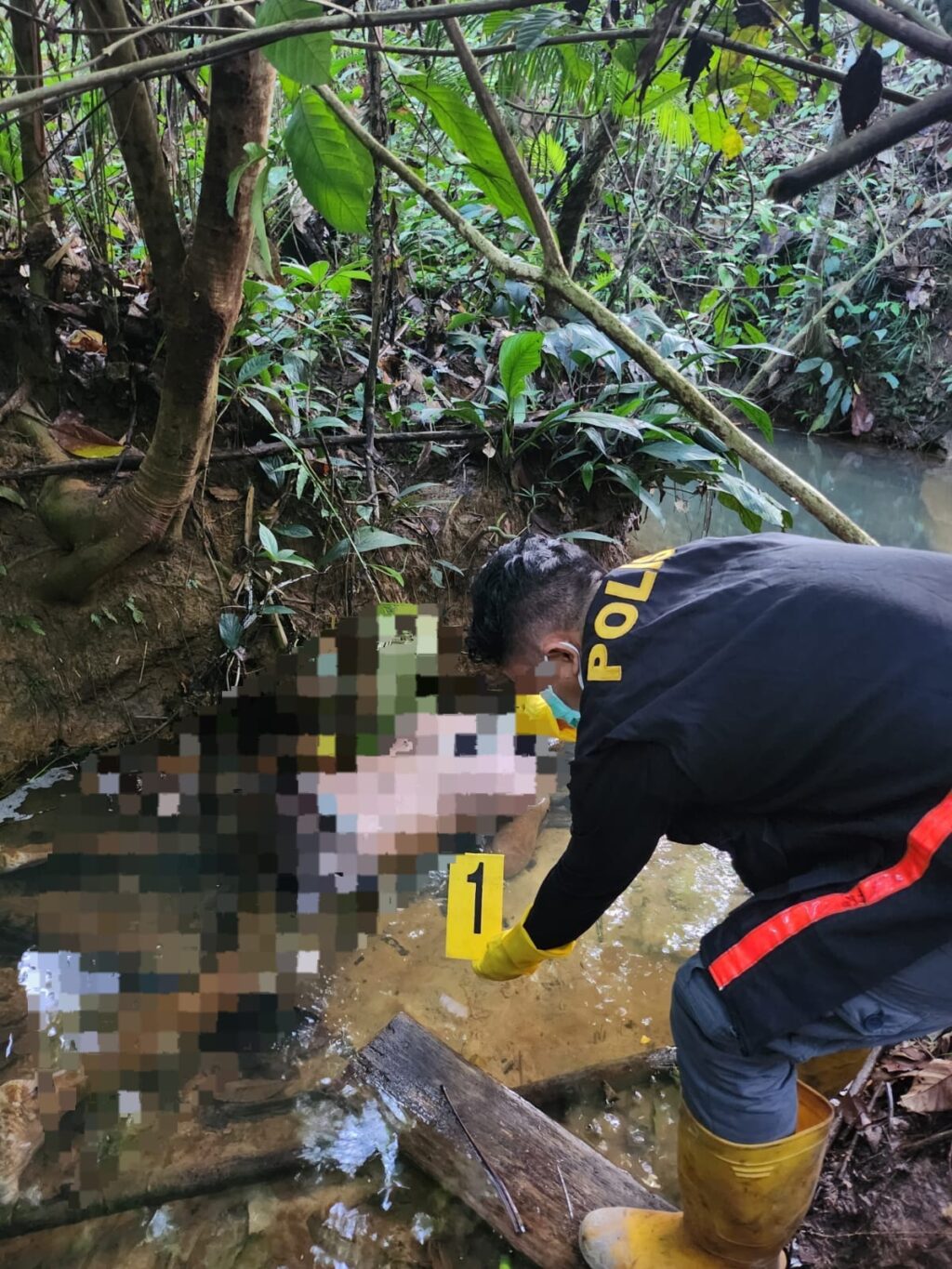 Dari hasil pemeriksaan di tempat kejadian perkara ditemukan celana dan baju korban dalam keadaan terlepas ditemukan di ranting dekat sungai, skuter metik milik korban terparkir di depan jalan menuju sungai dan 1 buah gayung serta tempat sabun mandi berada di sungai di samping tubuh korban.