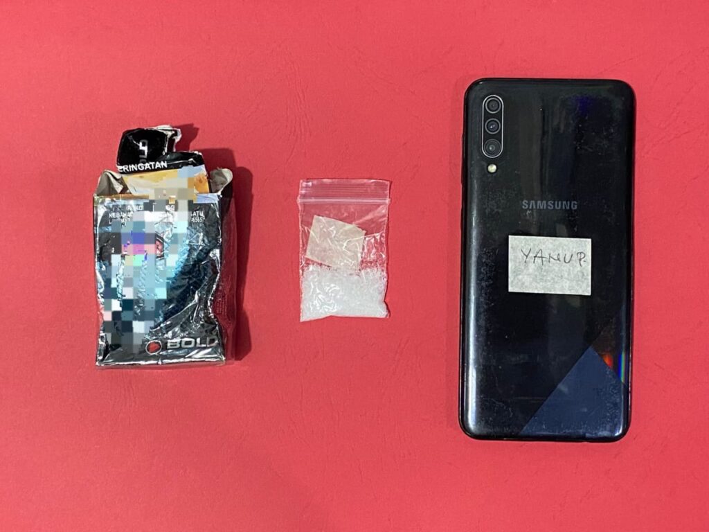 Petugas kemudian memberhentikan pelaku dan terlihat pelaku membuang sesuatu ke semak-semak, saat diperiksa ditemukan 1 bekas kotak rokok yang didalamnya terdapat bungkusan plastik klip yang berisi serbuk Kristal bening diduga sabu-sabu yang diakui adalah miliknya.