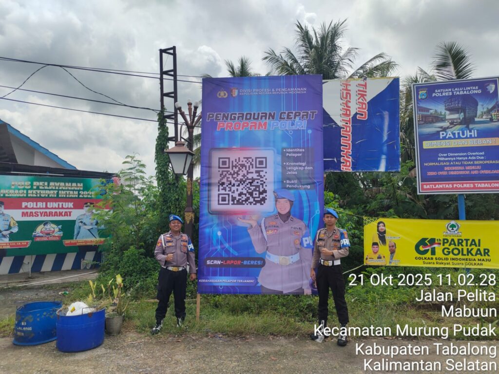 TANJUNG, TRIBUNEPLUSONLINE.COM Seksi Profesi dan Pengamanan (Sie Propam) Polres Tabalong melaksanakan pemasangan spanduk pelayanan cepat melalui QR Barcode Layanan Pengaduan Masyarakat (Dumas) Propam Polri, Selasa (22/10). Kegiatan ini bertujuan memberikan kemudahan kepada masyarakat dalam menyampaikan laporan atau aduan terhadap pelayanan maupun perilaku anggota Polri.