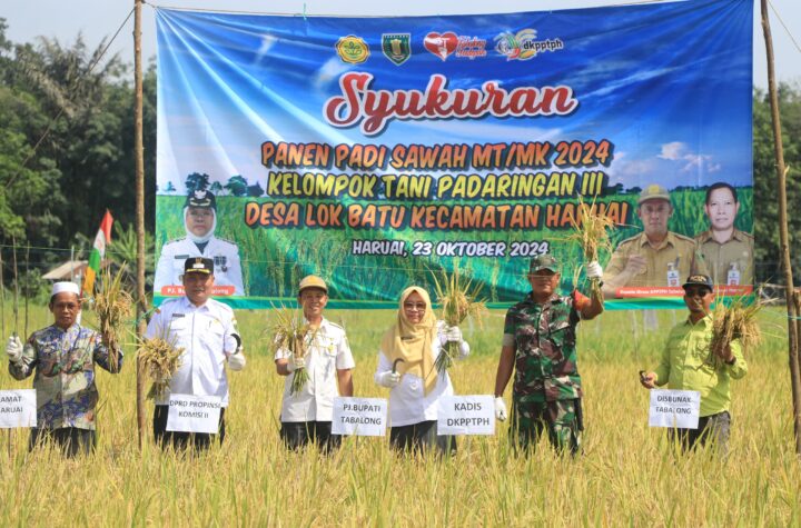 TANJUNG,TRIBUNEPLUSONLINE.COM Penjabat (Pj) Bupati Tabalong, Hj Hamida Munwarah bersama Kelompok tani Padaringan III di Desa Lok Batu menggelar syukuran panen...
